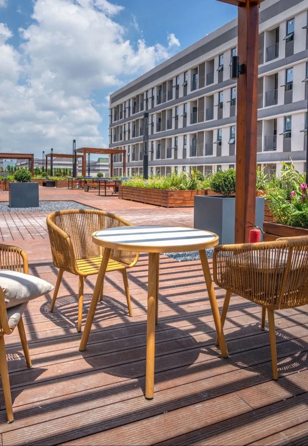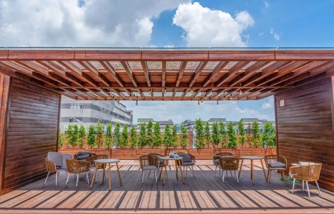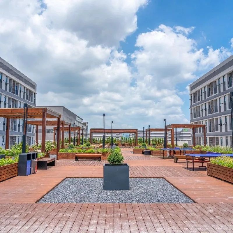 公共服務(wù)中心三層平臺設(shè)置了屋頂花園,形成半開放式創(chuàng)新社區(qū)??紤]到公共服務(wù)中心宿舍的分布,屋頂花園位于兩側(cè)宿舍動線中軸。