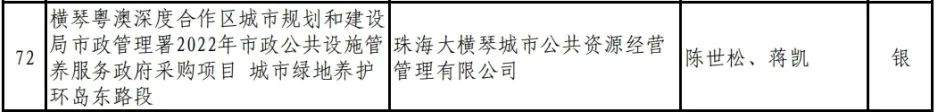 喜訊,2023年度,廣東省風(fēng)景園林與生態(tài)景觀協(xié)會科學(xué)技術(shù)獎(園林工程獎)評選日前落幕,珠海大橫琴城市公共資源經(jīng)營管理有限公司(以下簡稱大橫琴城資)管養(yǎng)的橫琴粵澳深度合作區(qū)城市規(guī)劃和建設(shè)局市政管理署2022年市政公共設(shè)施管養(yǎng)服務(wù)政府采購項目——城市綠地養(yǎng)護(hù)環(huán)島東路段榮獲養(yǎng)護(hù)類銀獎。