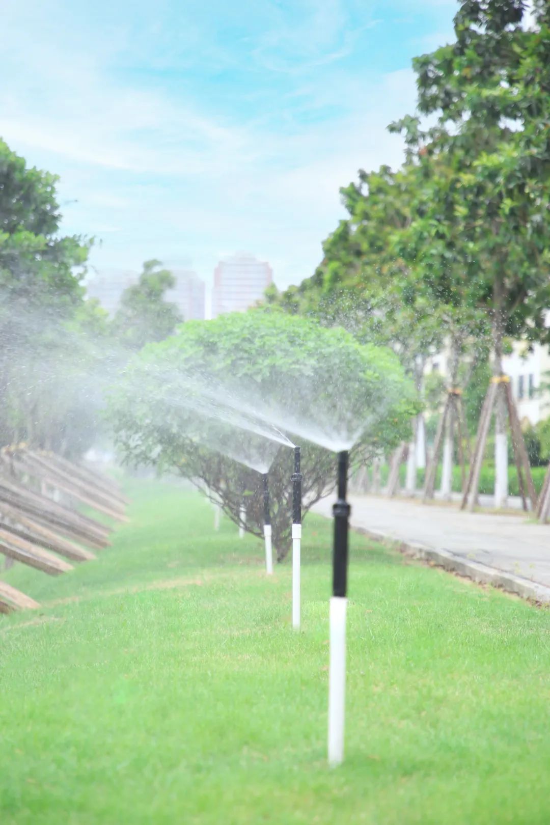 改造過(guò)程中,因地制宜開(kāi)展精細(xì)化修剪和作業(yè),讓苗木煥發(fā)出蓬勃的生機(jī)與活力,并升級(jí)綠化澆灌系統(tǒng),采用灑水車(chē)+噴淋系統(tǒng)相結(jié)合的澆灌方式,切實(shí)提升綠化管養(yǎng)水平。此外,將綠植與造景相結(jié)合,在重要節(jié)點(diǎn)處打造道路小景,注重景觀(guān)層次和植被多樣豐富性,營(yíng)造綠意盎然、自然和諧的城市綠化空間。